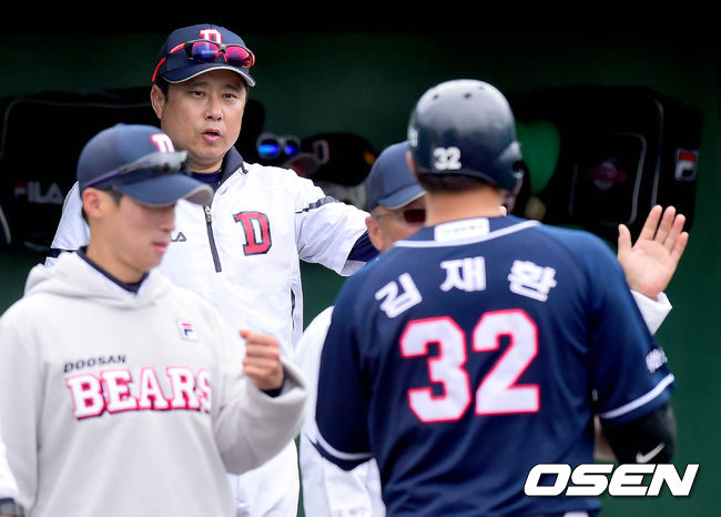오후에 진행된 KIA와 두산의 연습경기, 4회초 두산 공격 선두타자로 나선 김재환이 솔로포를 날리고 김태형 감독과 인사를 나누고 있다.