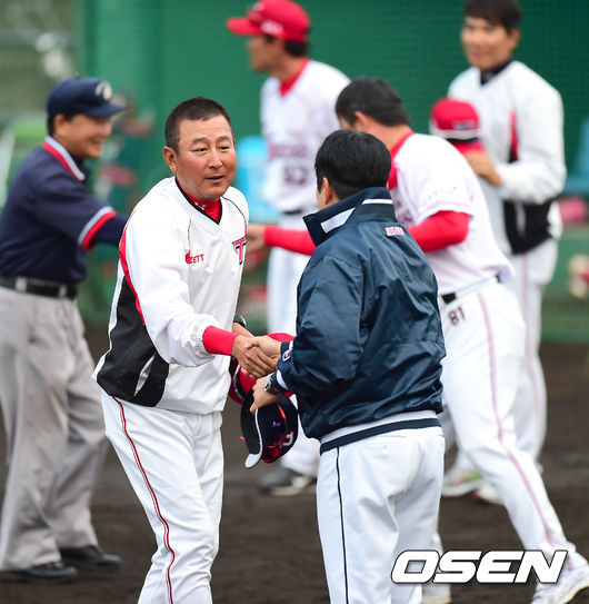 오후에 진행된 KIA와 두산의 연습경기, 양팀이 9회까지 경기를 펼쳐 6-6으로 승부를 가리지 못했다. 경기 종료 후 KIA 김기태 감독과 두산 김태형 감독이 인사를 나누고 있다.