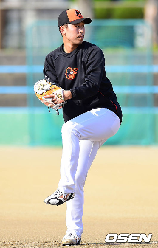 KIA 마무리훈련에 합류한 미국 메이저리그 볼티모어 윤석민이 캐치볼로 몸을 풀고 있다.