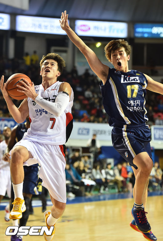 19일 오후 전라북도 전주시 전주실내체육관에서 열린 '2014-2015 KCC 프로농구' 전주 KCC 이지스와 안양 KGC 인삼공사의 경기, 3쿼터 KGC 박찬희가 레이업슛을 시도할때 KCC 신명호가 날아오르고 있다.