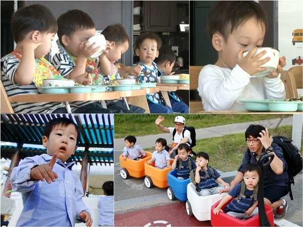 서언-서준이는 칼 군무같이 똑 같은 모습으로 밥을 먹는 씩씩한 삼둥이 형들을 신기하게 바라보다 이내 숟가락을 들고, 삼둥이 형들과 합을 맞춰 폭풍 숟가락질을 시작했다. 특히 서언이는 국그릇을 통째로 들고 원샷을 하는 대한이를 유심히 지켜보다 자신도 국그릇을 들고 원샷을 시도해 웃음을 자아냈다.
