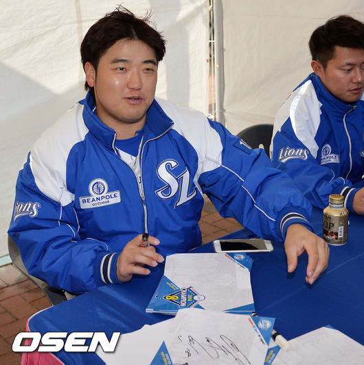 22일 오후 대구 북구 산격동 대구실내체육관에서 열린 삼성 라이온즈 '프로야구 최초 통합 4연패 기념 2014 팬 페스티벌', 박석민이 팬들에게 사인을 해주며 미소짓고 있다.