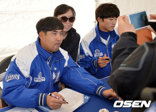 22일 오후 대구 북구 산격동 대구실내체육관에서 열린 삼성 라이온즈 '프로야구 최초 통합 4연패 기념 2014 팬 페스티벌', 장원삼이 팬과 셀카를 찍고 있다.