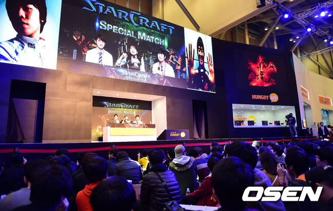 22일 오후 부산 벡스코(BEXCO)에서 열린 '지스타 2014', 헝그리앱 부스에서 스타크래프트1 스페셜 메치가 열리고 있다.