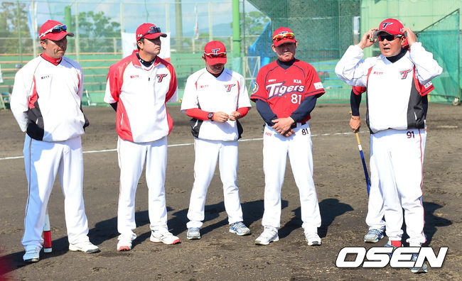 KIA 김기태 감독을 비롯한 코칭스태프들과 선수들이 훈련을 마치고 미팅을 갖고 있다.