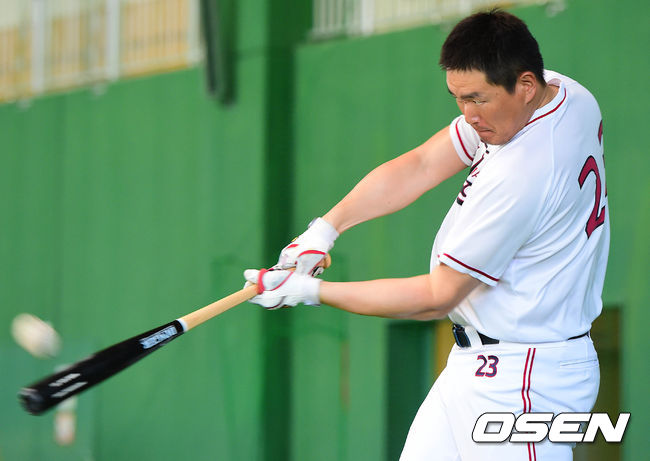 KIA 최희섭이 실내 타격 훈련을 진행하고 있다.