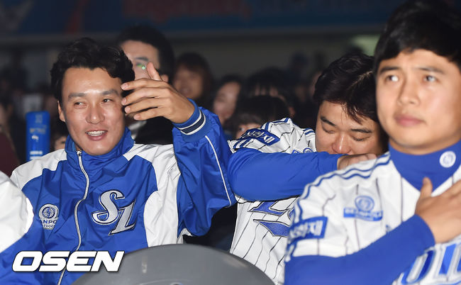 22일 오후 대구 북구 산격동 대구실내체육관에서 삼성 라이온즈 '프로야구 최초 통합 4연패 기념 2014 팬 페스티벌'이 진행되고 있다. 삼성 이승엽과 박석민이 한국시리즈 영상을 보며 팔꿈치로 하이파이브를 하고 있다.