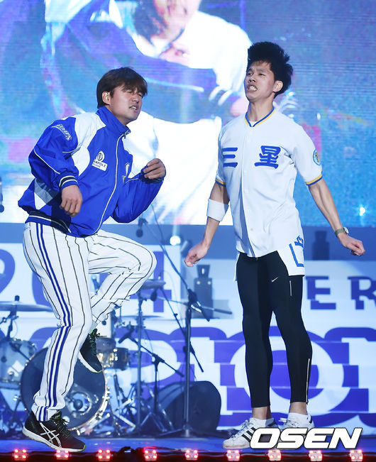 22일 오후 대구 북구 산격동 대구실내체육관에서 열린 삼성 라이온즈 '프로야구 최초 통합 4연패 기념 2014 팬 페스티벌', 삼성 김상수가 팬과 댄스 배틀을 벌이고 있다.