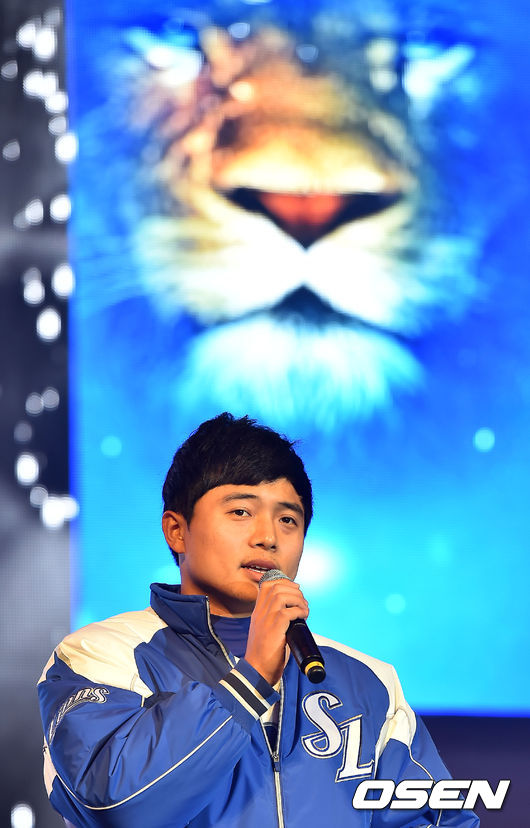 22일 오후 대구 북구 산격동 대구실내체육관에서 열린 삼성 라이온즈 '프로야구 최초 통합 4연패 기념 2014 팬 페스티벌'에서 선수와 팬이 참가하는 라이온즈 수퍼스타 K에서 김헌곤이 열창을 하고 있다.