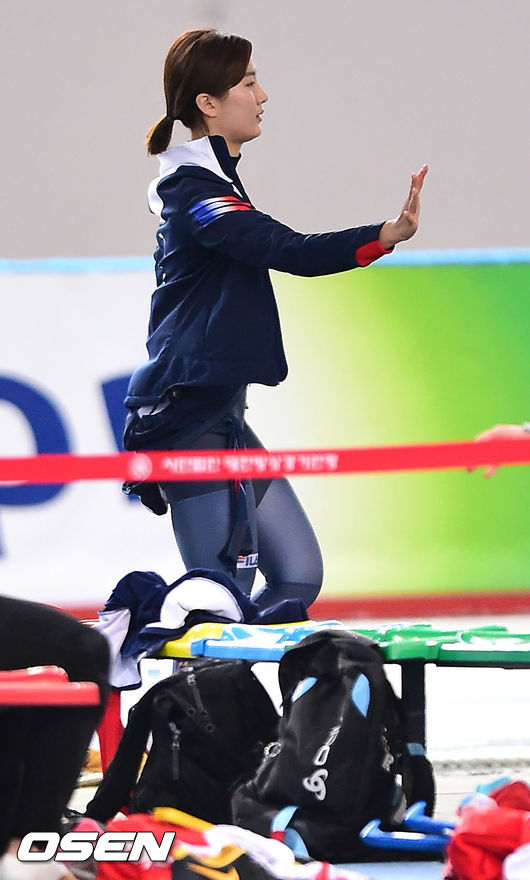 23일 서울 노원구 태릉 국제스케이트장에서 열리는 '2014~2015 ISU 스피드스케이팅 월드컵' 웜업 타임에 박승희가 동료들에게 인사를 하고 있다.