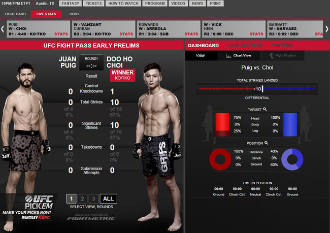 최두호는 10번의 타격 중 한 번의 카운터펀치를 KO로 연결하는 펀치력까지 과시했다. 여러 모로 최두호의 UFC 데뷔전은 강렬한 첫 인상을 남긴 셈이다.