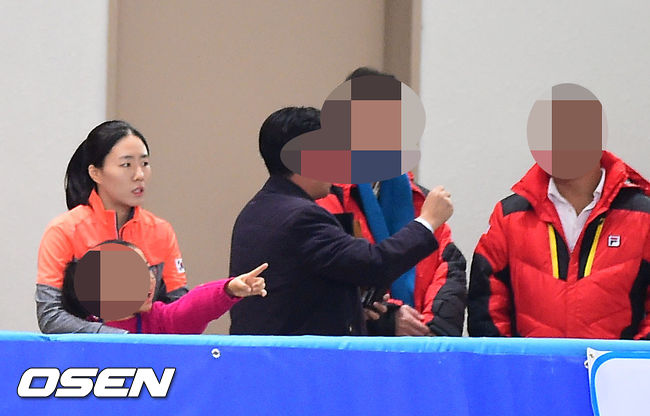 23일 서울 노원구 태릉 국제스케이트장에서 열리는 '2014~2015 ISU 스피드스케이팅 월드컵' 여자 1000m 디비전 A경기에서 이상화가 박승희를 응원하고 있다.