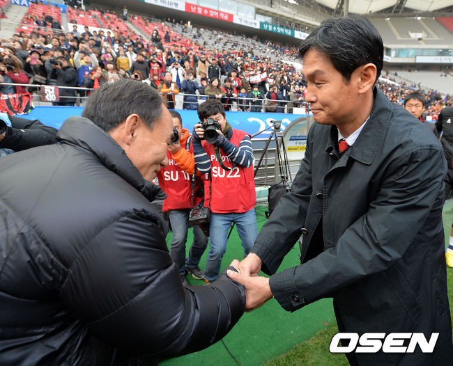 23일 오후 서울월드컵경기장에서 열린 FC서울과 성남FC의 '2014 하나은행 FA컵 결승전, 성남 김학범 감독과 서울 최용수 감독이 악수를 나누고 있다.