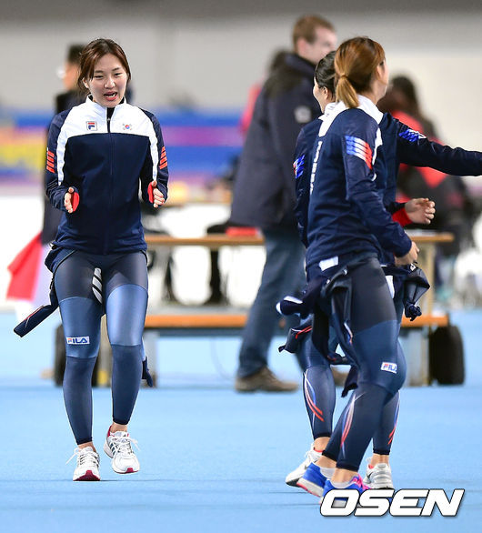 23일 서울 노원구 태릉 국제스케이트장에서 열린 '2014~2015 ISU 스피드스케이팅 월드컵' 여자 팀 추월 경기를 앞두고 박승희 이상화 장미가 연습을 하고 있다.