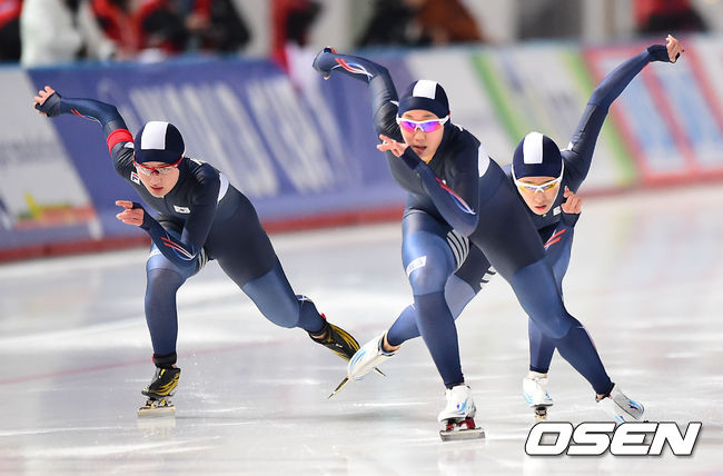 여자 팀 추월 경기에서 박승희와 장미, 이상화가 역주하고 있다./ soul1014@osen.co.kr