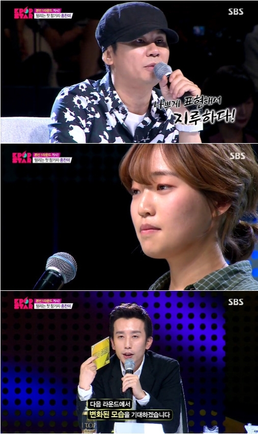 'K팝스타4' 유희열과 양현석, 박진영이 첫 참가자 홍찬미를 두고 엇갈리는 평가를 내놨다.