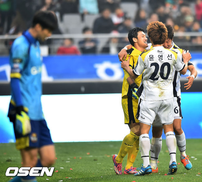 승부차기를 마치고 성남 골키퍼 박준혁이 동료들과 기쁨을 나눌때 서울 골키퍼 유상훈이 고개를 떨구고 있다. / rumi@osen.co.kr