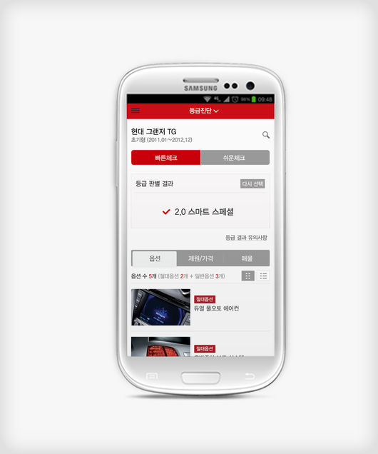 어플에서 등급 구분은 물론 차량 제원, 현재 거래 중인 동급 중고차 매물까지 함께 볼 수 있어 중고차 매매 시 필요한 많은 정보를 한 눈에 파악할 수 있다.
