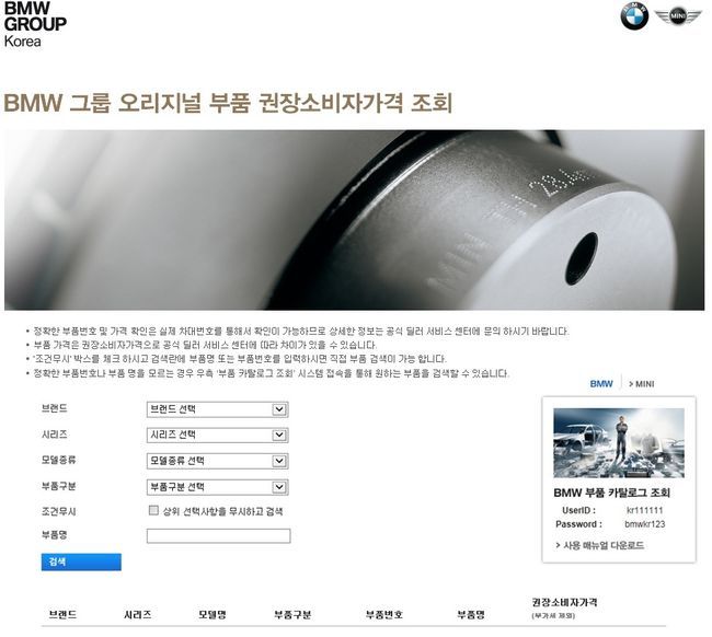 BMW 그룹 오리지널 부품 권장소비자가격 조회 웹사이트 캡처.