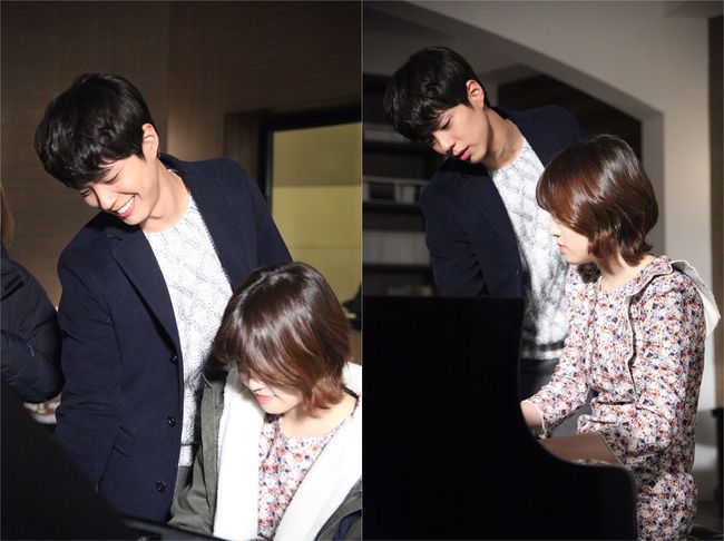 공개된 사진 속 박보검은 넋 놓고 피아노 앞에 앉아 있는 심은경의 옆에 서서 가볍게 오른손으로 건반을 누르고 있다. 그러다 두 사람은 함께 젓가락 행진곡을 연주하며 은근한 달달 모드를 연출해 시선을 끈다.