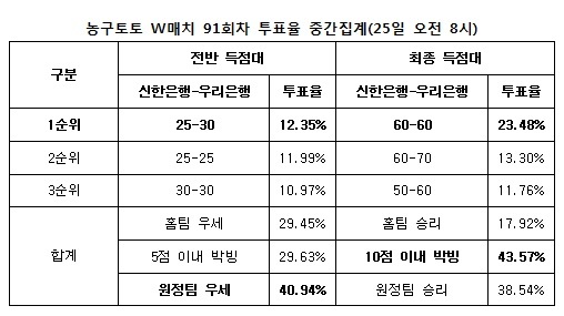 국민체육진흥공단(www.kspo.or.kr)이 발행하는 체육진흥투표권 수탁사업자인 스포츠토토 공식 온라인 발매사이트인 베트맨(www.betman.co.kr)이 오는 26일 오후 7시 인천도원체육관에서 벌어지는 신한은행-우리은행전을 대상으로 한 농구토토 W매치 91회차 투표율을 중간 집계한 결과, 전체 참가자의 43.57%가 두 팀의 10점 이내 박빙을 예상하는 것으로 나타났다.