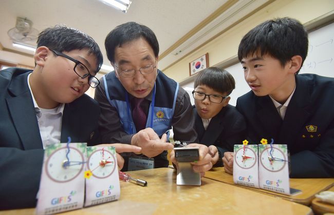 성광호 대한민국명장이 중학생들에게 시계 만드는 법을 설명하고 있다.(위) 우장균 대한민국명장이 중학생들에게 태양열 발전기 만드는 법을 설명하고 있다.(아래) / 한국산업인력공단