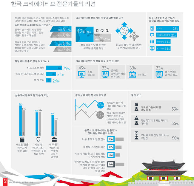 이러한 모바일, 소셜 미디어 등 새로운 플랫폼의 등장과 기술의 변화가 국내 크리에이티브 전문가들에게 큰 도전으로 다가오고 있다. 국내 응답자의 81%가 '모바일이 크리에이티브 및 디자인의 모습을 바꾸고 있다'고 답했다. 응답자 중 91%는 '업계 변화에 대응해 최신 흐름을 계속 유지하지 않으면 뒤처질 것'이라고 우려했는데 이 수치는 아태지역 평균인 84%보다 높은 수치다. 또한 응답자 중 87%는 '새로운 툴과 테크닉을 배워야 한다'고 응답했다.