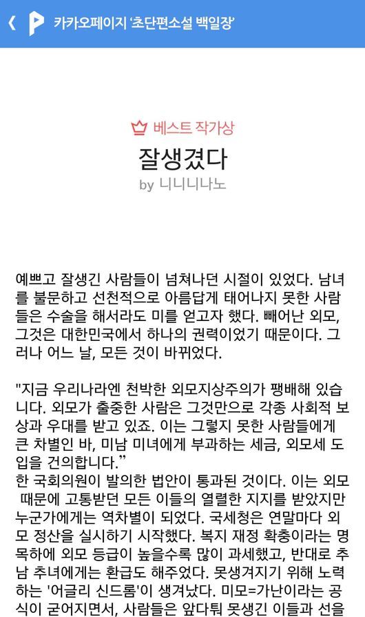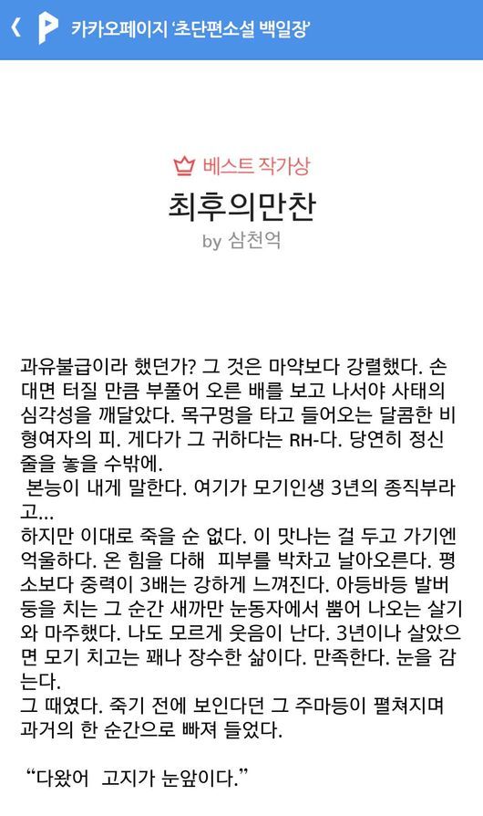 다음카카오(공동대표 최세훈, 이석우)가 모바일 콘텐츠 플랫폼 카카오페이지에서 진행한 '초단편소설 백일장'의 수상작을 발표했다. 지난 10일부터 2회에 걸쳐 진행된 초단편소설 백일장은 15일과 24일 각 100명씩 총 200명의 수상작을 발표하며 성황리에 막을 내렸다.