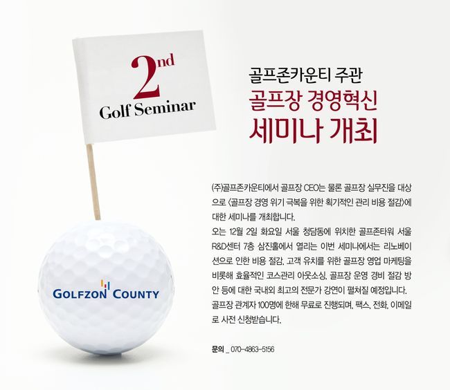 골프존카운티가 주관하고 (사)한국골프장경영협회와 (사)한국대중골프장협회가 후원하는 이번 세미나는 골프장 경영위기 극복을 위한 대안을 제시하고 골프업계 상생방안을 모색하는 의미 있는 자리가 될 것으로 기대된다.
