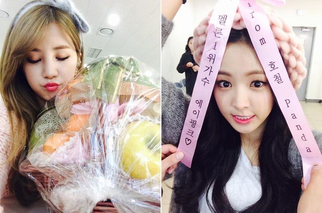 공개된 사진 속에는 과일바구니를 안은 채 깜찍한 표정을 짓고 있는 박초롱의 모습이 담겨있다. 이어 공개된 사진에서는 깜찍한 모자 위에 팬들이 직접 제작한 리본을 달고 있는 손나은의 모습이 담겨있다. 특히 두 사람은 팬들이 보내준 선물을 직접 인증해 훈훈함을 자아냈다.