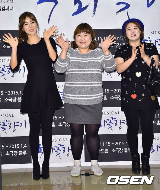 26일 오후 서울 충무아트홀 소극장 블루에서 열린 뮤지컬 '국화꽃향기' VIP데이 행사에서 개그우먼 맹승지 홍윤화 심진화가 포토타임을 갖고 있다.