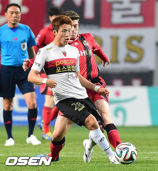 26일 오후 서울월드컵경기장에서 열린 2014 K리그 클래식 FC 서울과 포항 스틸러스의 경기 전반 손준호와 오스마르가 볼다툼을 하고 있다.