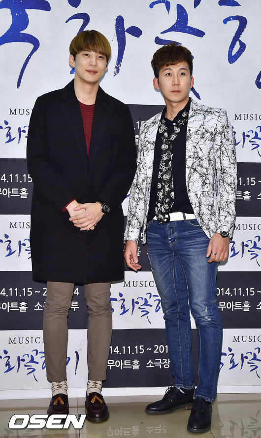 26일 오후 서울 충무아트홀 소극장 블루에서 열린 뮤지컬 '국화꽃향기' VIP데이 행사에서 록키스의 칸과 쿤이 포토타임을 갖고 있다.
