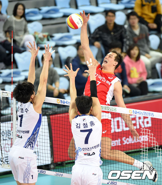 1세트 한국전력 쥬리치가 대한항공의 블로킹 벽을 피해 공격을 시도하고 있다.