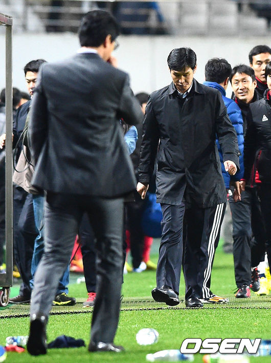 26일 오후 서울월드컵경기장에서 열린 2014 K리그 클래식 FC 서울과 포항 스틸러스의 경기 종료 후 최용수 감독이 고개를 숙인 채 황선홍 감독 쪽으로 향하고 있다.