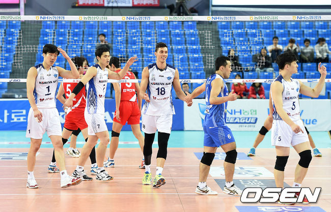 경기 종료 후 대한항공 선수들이 승리의 기쁨을 나누고 있다. /sunday@osen.co.kr