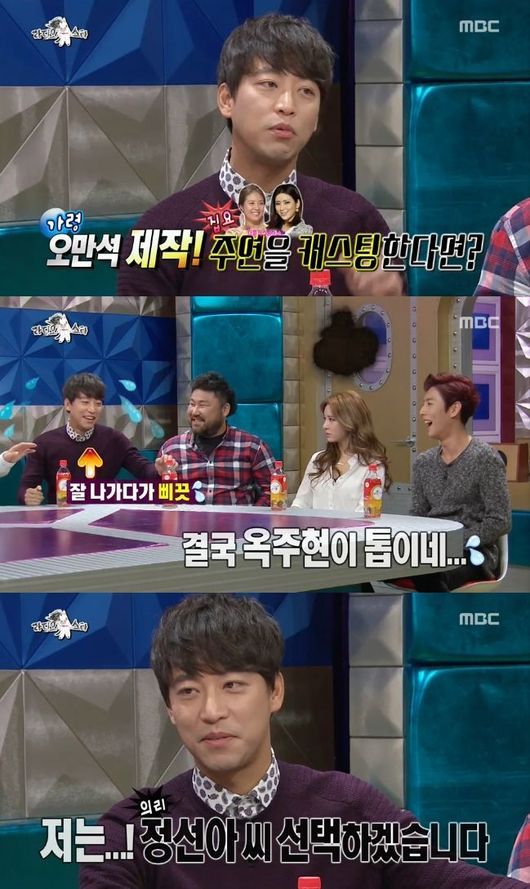 이에 MC들은 둘 중 한 사람과 공연을 하고픈 사람을 꼽으라고 제안했고 오만석은 "나는 더블 캐스팅을 하곘다"고 말했고, 이내 "하나만 해야한다"는 말에 "정선아를 택하겠다. 옥주현 씨는 너무 비싸다"라고 말해 웃음을 줬다.