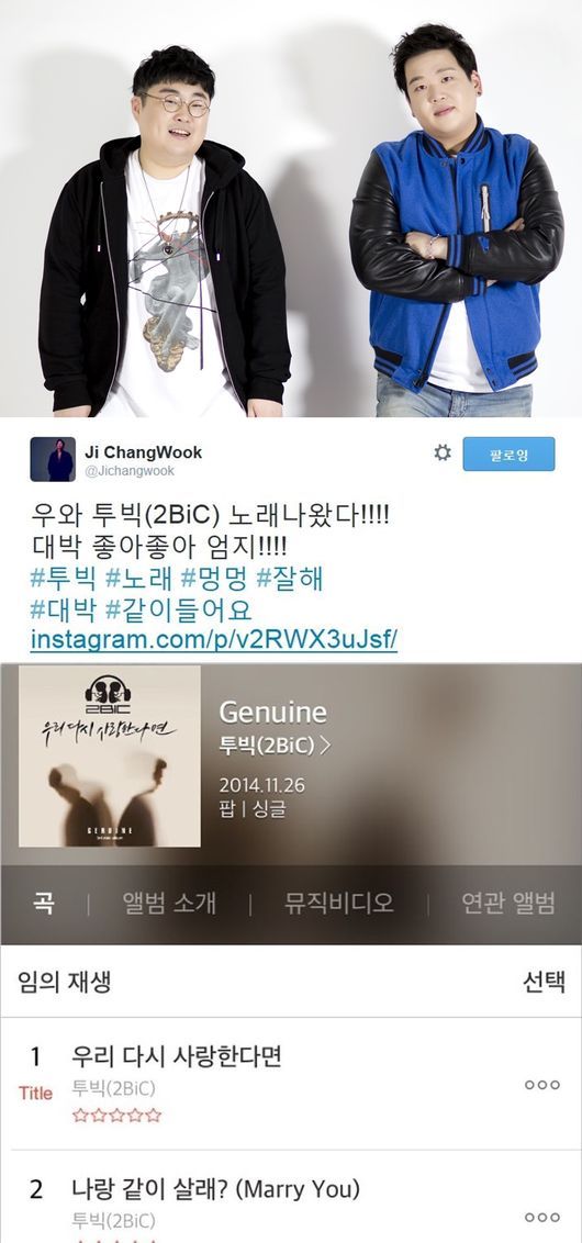 지창욱은 지난 26일, 자신의 트위터와 인스타그램을 통해 "우와 투빅(2BiC) 노래나왔다. 대박 좋아 엄지!"라는 글과 함께 휴대폰 속 투빅의 신곡 플레이리스트 장면을 캡쳐해 공개했다.