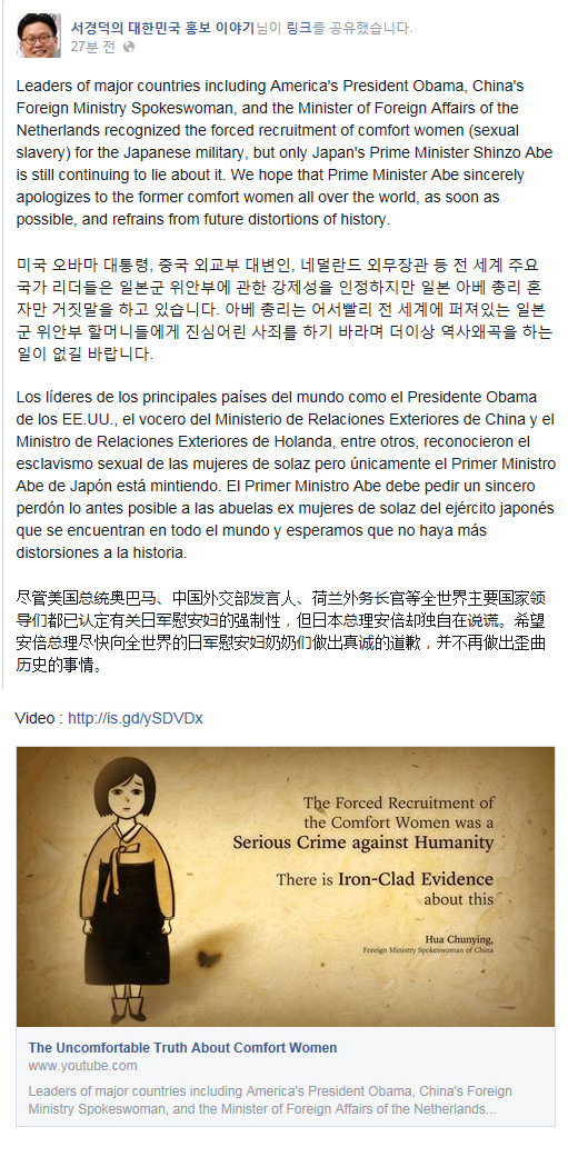뉴욕타임스 등 전 세계 주요 매체에 일본의 역사왜곡을 비판하는 광고를 꾸준히 게재해 온 한국 홍보 전문가 서경덕 교수가 전 세계 페이스북 사용자들을 대상으로 일본 아베 총리 비판 광고를 올렸다고 27일 밝혔다.