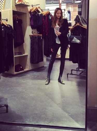 공개된 사진 속에는 블랙 카디건에 가죽 스키니진을 입은 채 거울에 비친 자신의 모습을 찍고 있는 혜박의 모습이 담겨있다. 특히 혜박은 쭉 뻗은 각선미를 자랑하고 있어 눈길을 끈다.
