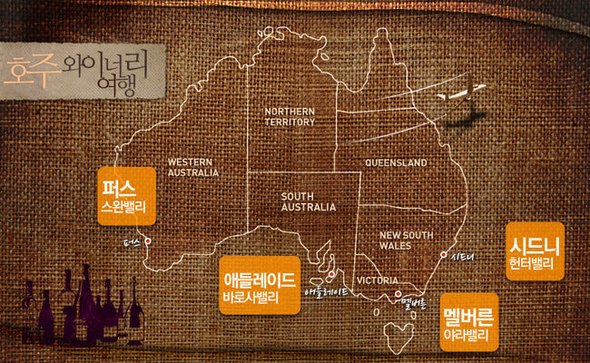 호주는 전 세계 와인 생산량의 4%를 생산하고 있는 호주는 프랑스, 독일, 이탈리아 등 유럽의 유명 와인 생산 국가들과 어깨를 나란히 할 정도로 유명한 와인 생산지이다. 특히 호주의 남부 지역은 와인의 재료인 과실이 잘 자라는 기후로서, 넓은 자연 속에 거대한 와이너리가 펼쳐져 있다.