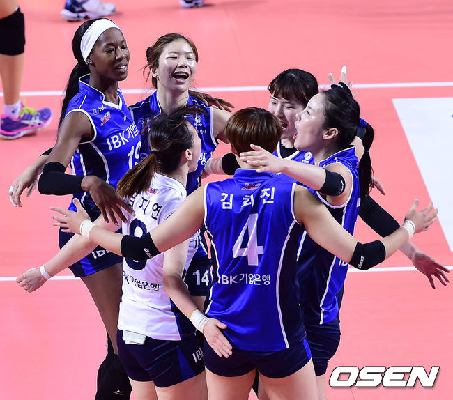 27일 오후 경기도 화성시 화성종합경기타운 실내체육관에서 열린 '2014-2015 NH농협 V-리그' IBK기업은행과 도로공사의 경기 1세트 IBK기업은행 선수들이 득점 후 기뻐하고 있다.
