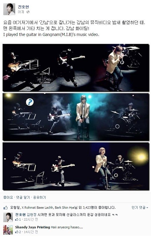 진호현은 24일 자신의 페이스북 페이지를 통해 ‘요즘 여기저기에서 '간남'으로 잘나가는 강남의 뮤직비디오 밤새 촬영하던 때. 맨 왼쪽에서 기타 치는 게 접니다. 강남 화이팅!’이라는 글과 함께 그가 출연한 뮤직 비디오 캡쳐 화면을 게재했다.