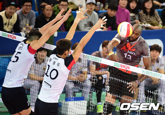 2세트 OK저축은행 시몬이 현대캐피탈 문성민, 윤봉우의 블로킹을 피해 강타를 날리고 있다./jpnews@osen.co.kr