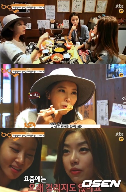 27일 JTBC에서는 여배우들의 19금 여행을 콘셉트로 한 '여우비행'이 첫방송 됏다. 이날 오윤아, 레이디제인, 김윤아는 오사카로 여행을 떠났다. 호텔에 집을 푼 세사람은 첫 장소로 라멘 집을 찾았고, 본격 토크를 시작했다.