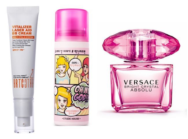 BRTC '바이탈라이저 레이저 에이드 비비크림', 에뛰드하우스 '오 마이 갓 드라이샴푸', 베르사체 '브라이트 크리스탈 앱솔루'(왼쪽부터).