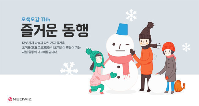 네오위즈홀딩스는 연말을 맞아 네오위즈게임즈, 네오위즈인터넷, 네오위즈CRS 등 전 계열사 임직원들이 자발적으로 참여하는 자원 활동 프로그램 ‘오색오감(五色五感)’을 28일부터 시작한다고 밝혔다.
