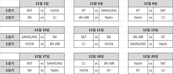 온게임넷이 공개한 대진표에 따르면 12월 3일 SKT와 후야, CJ와 IM의 경기를 시작으로 총 3주간 진행될 예정이다. 방송은 수요일과 목요일, 토요일 저녁 6시 30분에 편성된다.