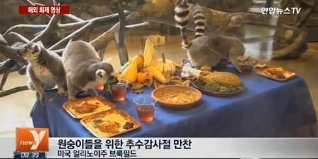 최근 미국 일리노이주의 브룩필드 동물원은 '동물들의 추수감사절' 만찬을 진행했다. 칠면조 모양의 비스킷, 고구마 파이, 각종 과일과 음료 등은 일락꼬리여우원숭이를 위해 동물들의 추수감사절 만찬을 준비했다.
