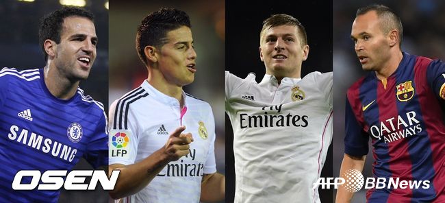 세스크 파브레가스-하메스 로드리게스-토니 크로스-안드레스 이니에스타 / ⓒAFPBBNews = News1(무단전재 및 재배포 금지)